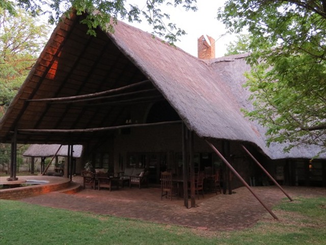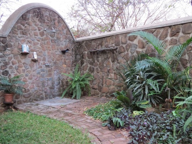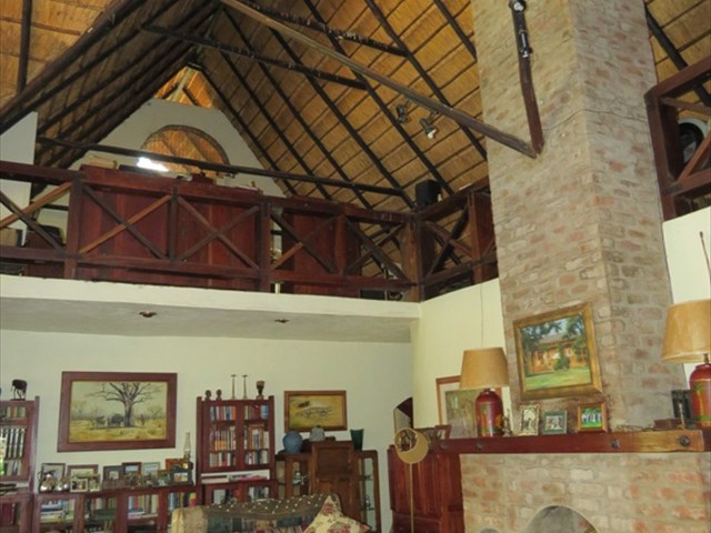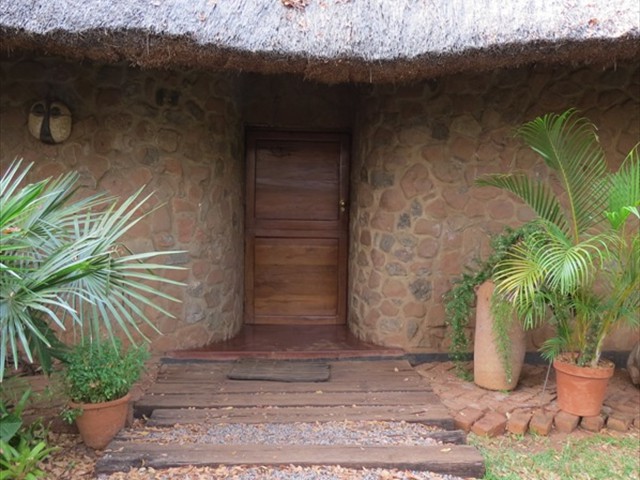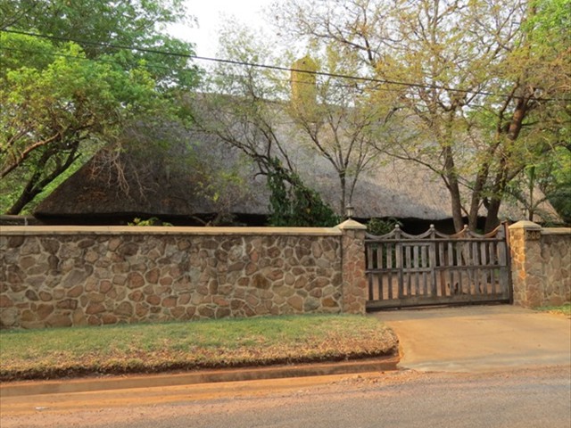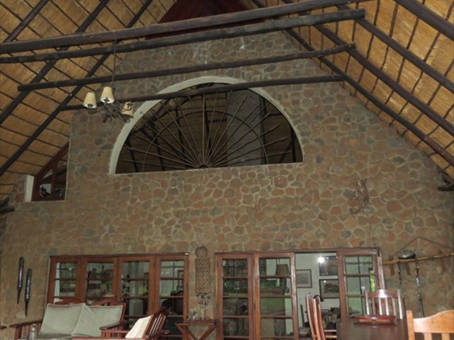 Victoria Falls Property reference - 0875 A beautiful home built of dolomite rock, professionally laid and pointed, under a high thatch roof. The thatching is done after the English style of batten - in - thatch, at the correct angle to ensure many years of life for the roof. All doors and windows are constructed of reclaimed Zambezi teak railway sleepers, with the lounge area floored in Zambezi Teak. The house is 300 square meters in extent, with a large 80 square meter veranda under high thatch roof, ideal for the Victoria Falls climate. A cool, inviting swimming pool extends from the veranda into a large walled garden. There are 2 spacious bedrooms. The master bedroom has bathroom and dressing room en-suite, with a mezzanine 'den' area above. Wide French doors lead to a delightful outdoor shower garden. Bedrooms open out onto mini verandas through big glazed doors with secure steel gates so one can comfortably and safely sleep with the doors open. A very high thatch roof keeps the interior cool on the hot months, with back-up air conditioning if required! The large upstairs mezzanine floor is ideal for office, gym, TV lounge or a spare room. The lounge sports a wonderful fireplace with soaring 13 meter chimney that draws the most amazing fires in winter! A well established garden has excellent trees and great shade. There is a fire pit for quiet evenings around the braai cooking with friends.